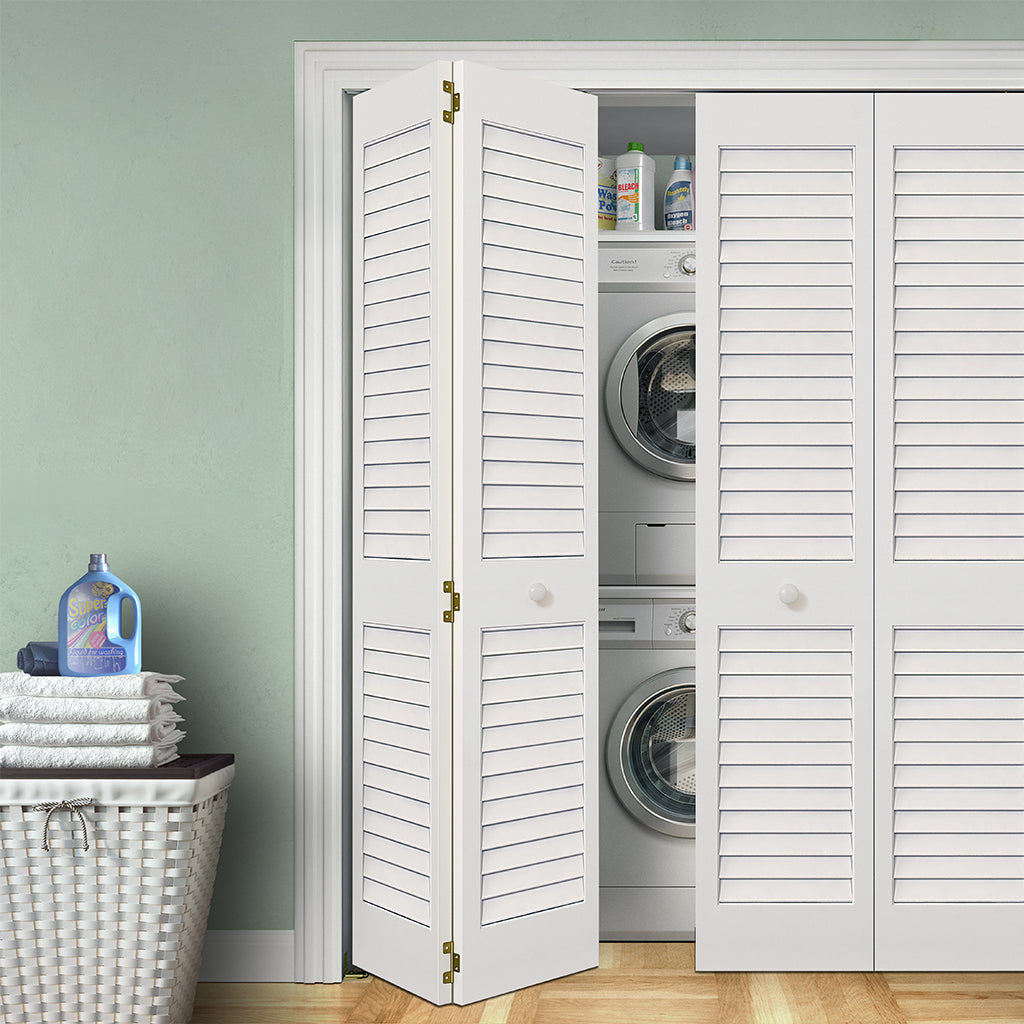 Featuring plantation wide louvers, these solid Pine Bi-fold doors have a modern clean style. The extra wide louvers offer maximum breathability. The high-quality vertical grain delivers the best appearance and performance. The bi-fold doors are durable and are easy to install (hardware is included). The doors are primed white and can be painted to match your decor.