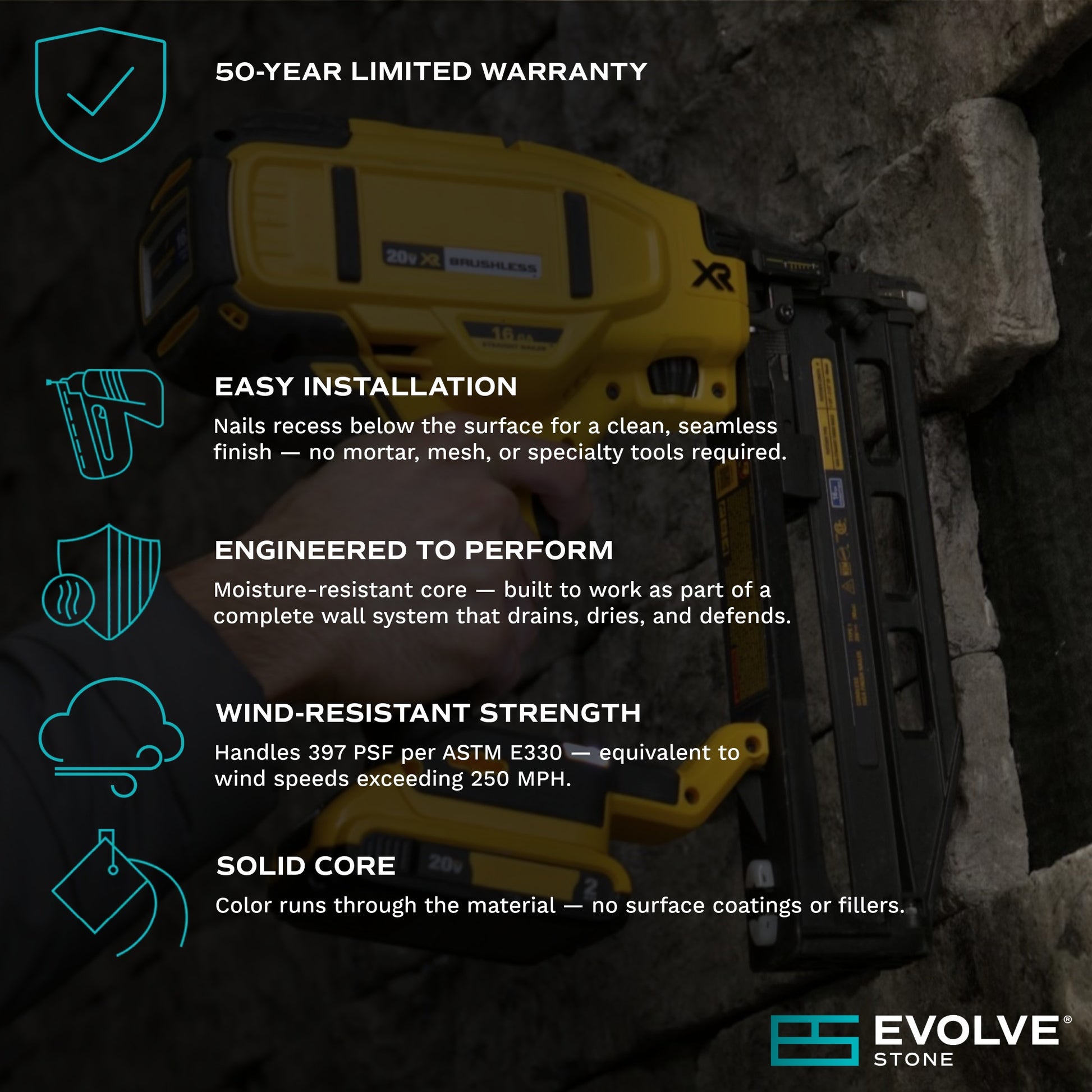 Evolve Stone is the first stone cladding that can be face nailed in the same fashion as traditional siding, reducing installation complexity and time dramatically. Like real stone, it is colored throughout, allowing it to be cut to fit on-site while maintaining the highest appearance standards. The ease and workability of the product is unprecedented. No specialty tools and training are needed to install Evolve Stone. Easily manipulate, cut, and texture the product with your standard woodworking tools. This stone is lightweight, at just 2 lbs. per square foot, but extremely durable, standing up to impossible wind speeds, salt spray, UV exposure, and freeze-thaw cycles. Each box is pre-portioned with engineered shapes allowing the pattern to appear naturally as you install. No need to sort and lay out the stones beforehand. We offer a class B fire rated product in each style and color. Coverage: Flats (loose stones) cover 14.25 sq. ft.; Sills cover 25 lin. ft.